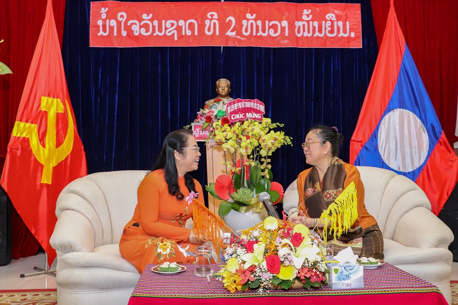 Bà Phimpha Keomixay - Tổng Lãnh sự Lào tại TP. Hồ Chí Minh (phía phải) trao đổi cùng bà Trần Kim Yến.