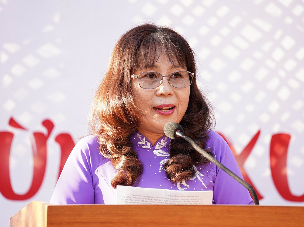 Bà Đoàn Xuân Thảo (ngụ tại TP. Thủ Đức), đại diện các gia đình nhận đỡ đầu sinh viên phát biểu cảm nghĩ khi tham gia Chương trình “Gia đình Việt với Sinh viên Lào, Campuchia đang học tập tại TP Hồ Chí Minh”.