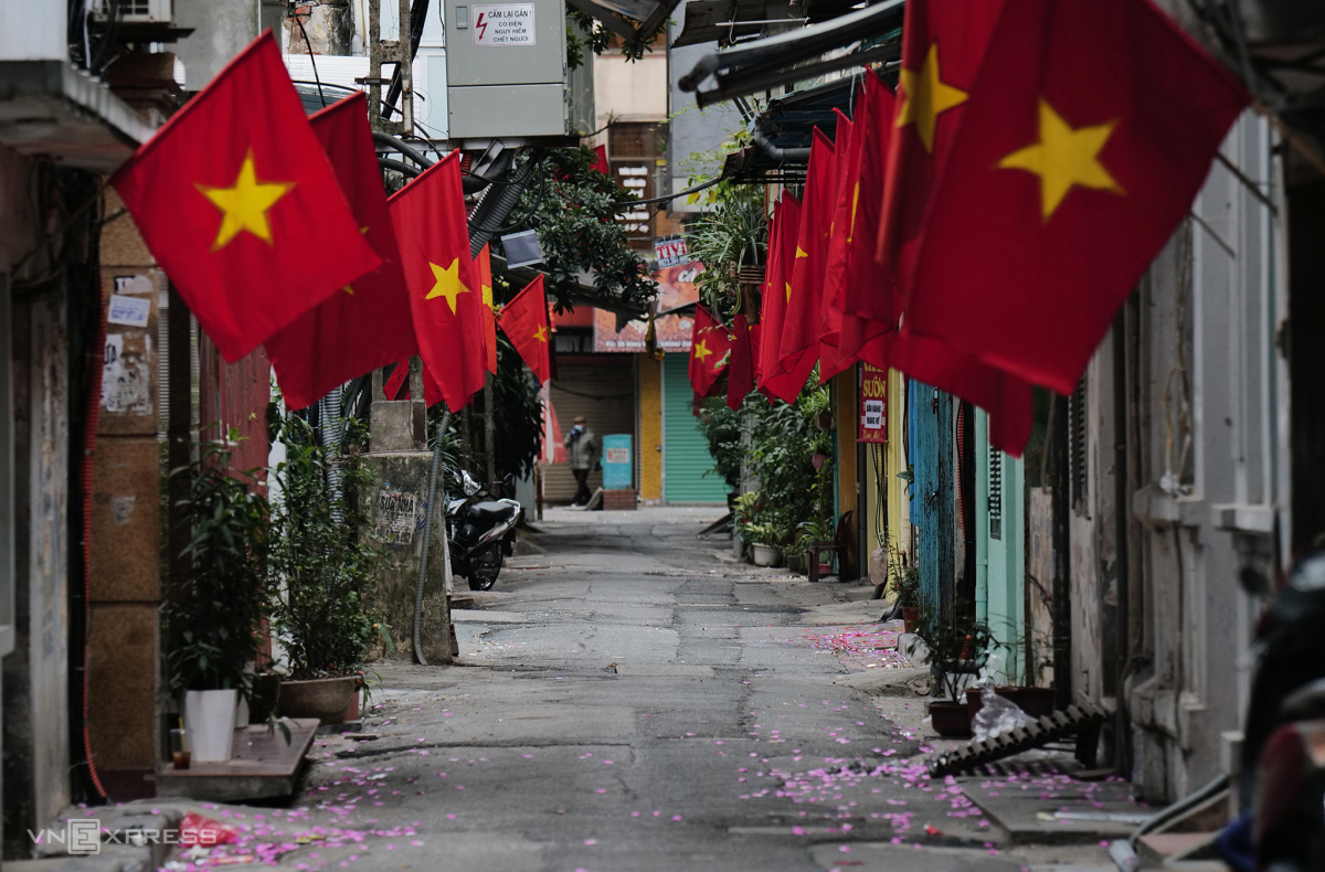 Ngõ nhỏ Cống Đục nằm trong phố cổ Hà Nội nổi bật với sắc cờ đỏ sao vàng. Khác mọi năm, Tết năm nay đường phố Hà Nội không được trang trí nhiều băng rôn, biểu ngữ, không có những đường ngập tràn sắc hoa.