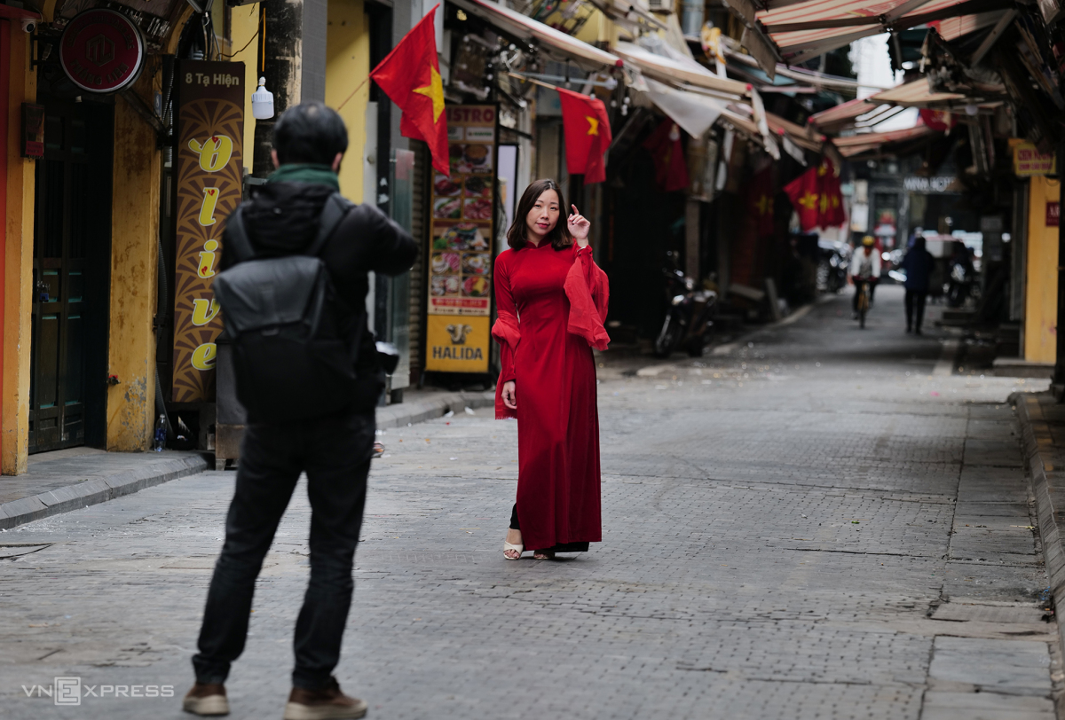 Từ sáng sớm, nhiều người tìm đến phố cổ Tạ Hiện để chụp hình lưu niệm.