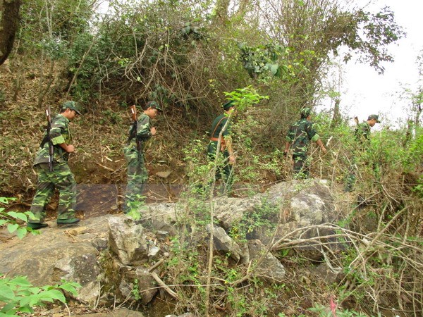 Các chiến sỹ đồn biên phòng cửa khẩu Tén Tằn tuần tra đường biên giới. (Ảnh: Nguyễn Nam/TTXVN)