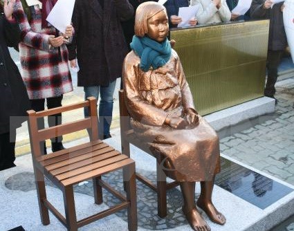 | Bức tượng cô gái trẻ tượng trưng cho những người phụ nữ bị ép buộc mua vui cho binh sỹ Nhật Bản trong Chiến tranh Thế giới thứ hai bên ngoài Lãnh sự quán Nhật Bản ở Busan. (Nguồn: Kyodo/TTXVN) |