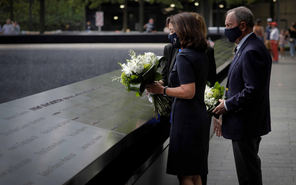 Bà Kathy Hochul, thống đốc bang New York, đặt hoa lên thành hồ tại Đài tưởng niệm và bảo tàng 11/9 ở Manhattan, New York ngày 8/9 - Ảnh: REUTERS