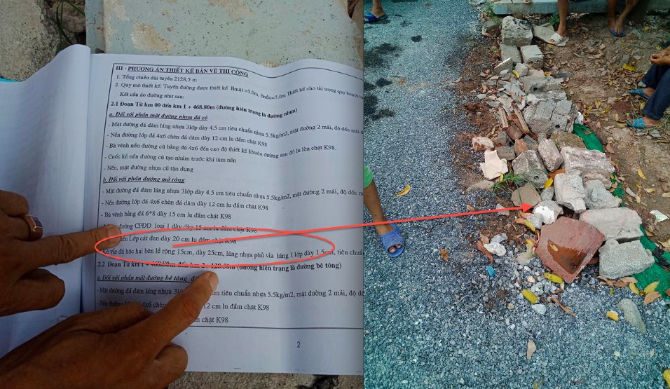 Một người dân khác còn phản ánh, trong quá trình thi công bên phía công ty làm đường không hề tưới nước để lu, nèn lớp đá hộc mà chỉ dàn lớp đá lẫn cả đất rồi tiến hành lu. Sau khi sự việc xảy ra cán bộ xã đã có cuộc gặp với đại diện bên phía đơn vị thi công thế nhưng việc khắc phục như nào người dân cũng không được thông báo, chỉ thấy một vị cán bộ trong xã ra ‘’thì thầm’’ với lái xe lu rồi cho xe tới lu lại đường – Người này cho biết thêm.