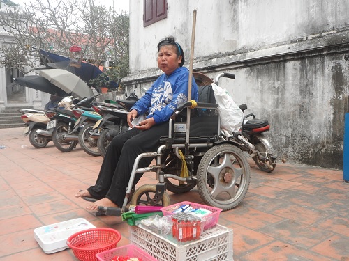 | Bà Trần Thị Ánh là người khuyết tật trước đây đi ăn xin năm nay đã được bố trí chỗ ngồi bán hàng, cân trọng lượng cơ thể nên có thu nhập tự nuôi sống bản thân |