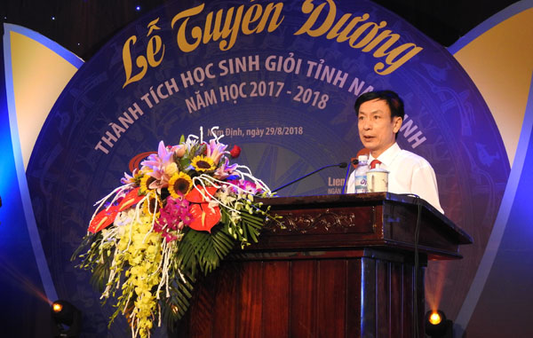 | Ông Phạm Đình Nghị, Chủ tịch UBND tỉnh Nam Định phát biểu tại lễ tuyên dương thành tích học sinh giỏi năm học 2017 - 2018. |