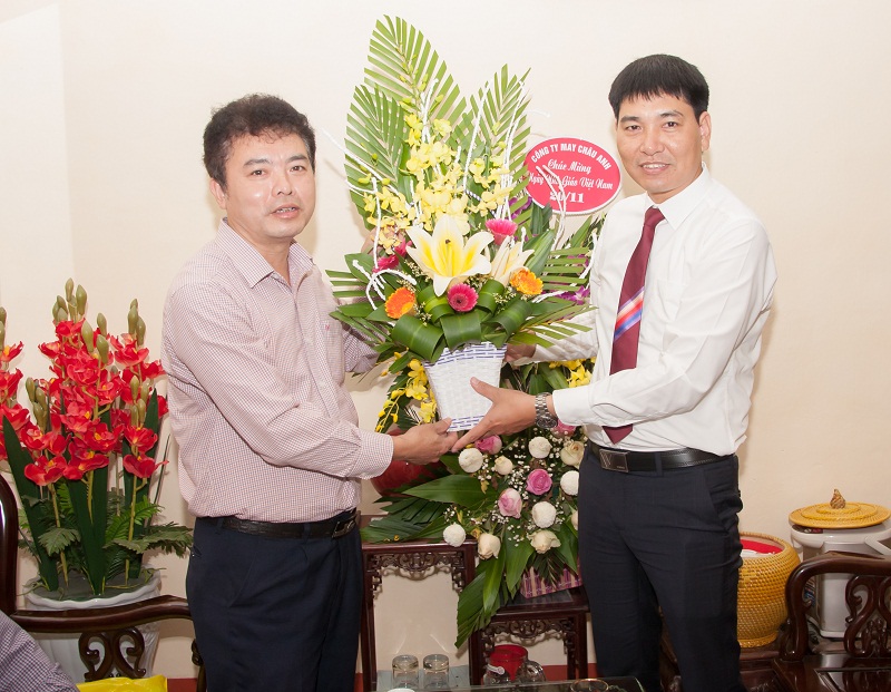 Thạc sỹ Nguyễn Duy Phương, Hiệu trưởng Trường THPT Mỹ Lộc, tỉnh Nam Định (bên phải) đón nhận lẵng hoa chúc mừng của lãnh đạo doanh nghiệp địa phương nhân dịp kỷ niệm Ngày nhà giáo Việt Nam (20/11).