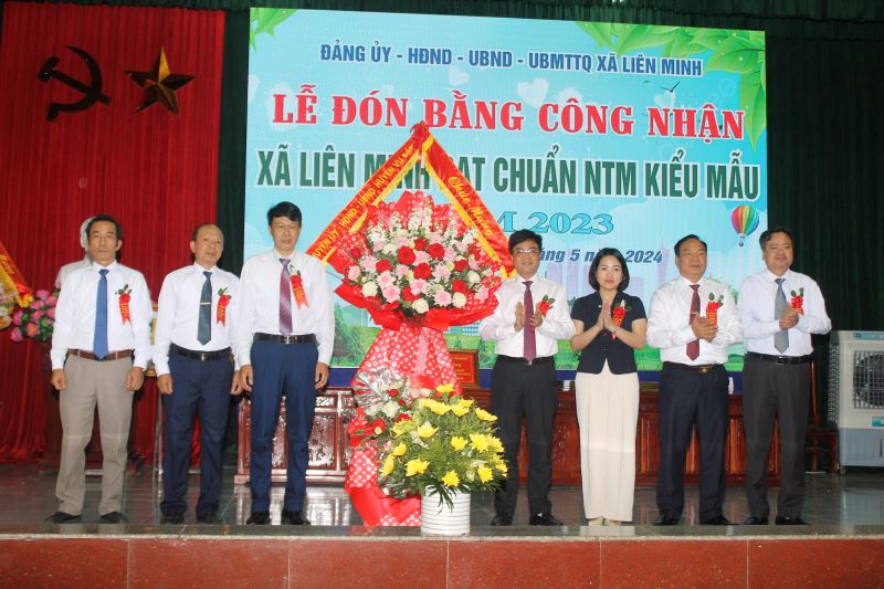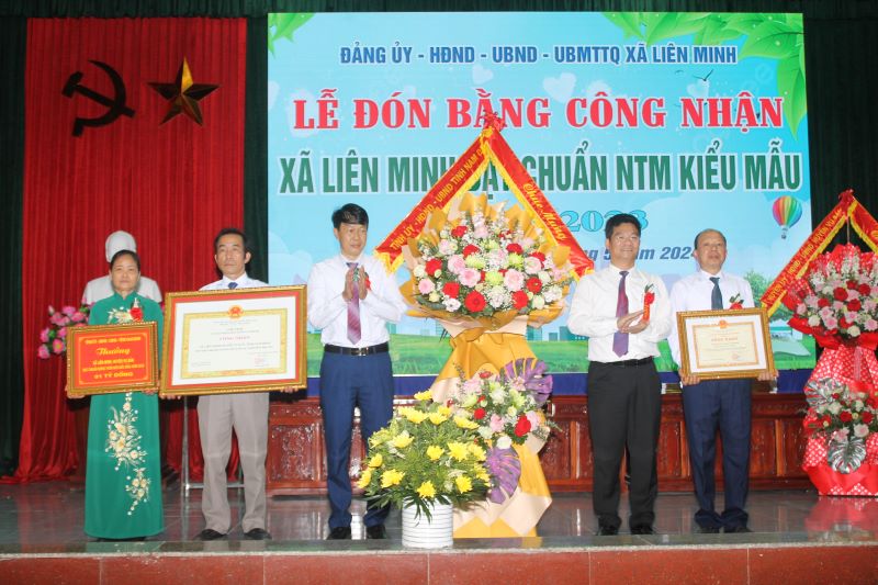 Đồng chí Trần Anh Dũng, Phó Chủ tịch Thường trực UBND tỉnh, Chủ tịch Hội đồng thẩm định xét công nhận xã NTM nâng cao, NTM kiểu mẫu giai đoạn 2021-2025 tỉnh Nam Định trao Bằng công nhận, Bằng khen, tiền thưởng của UBND tỉnh và lẵng hoa tươi thắm của Tỉnh ủy, HĐND, UBND tỉnh Nam Định cho cán bộ, nhân dân xã Liên Minh - Ảnh: Hồ Thanh