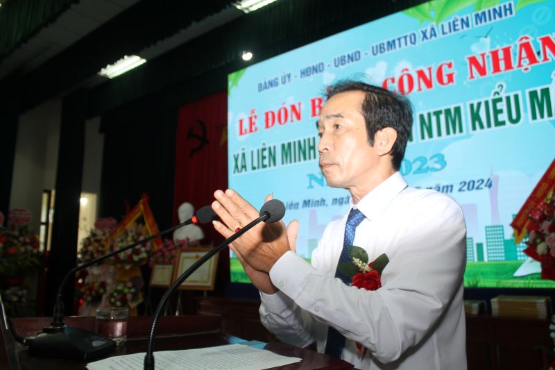 Đồng chí Hoàng Xuân Tài, Chủ tịch UBND xã Liên Minh trình bầy báo cáo kết quả xây dựng NTM kiểu mẫu tại địa phương - Ảnh: Hồ Thanh