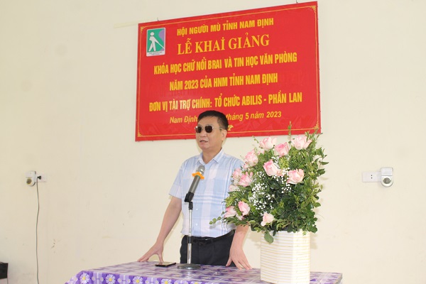 Ông Trần Xuân Dương, Ủy viên Trung ương Hội Người mù Việt Nam, Chủ tịch Hội Người mù tỉnh Nam Định kiêm Giám đốc Trung tâm hỗ trợ phát triển giáo dục hòa nhập Hội Người mù tỉnh Nam Định phát biểu tại lễ khai giảng khóa học - Ảnh: Hồ Thanh