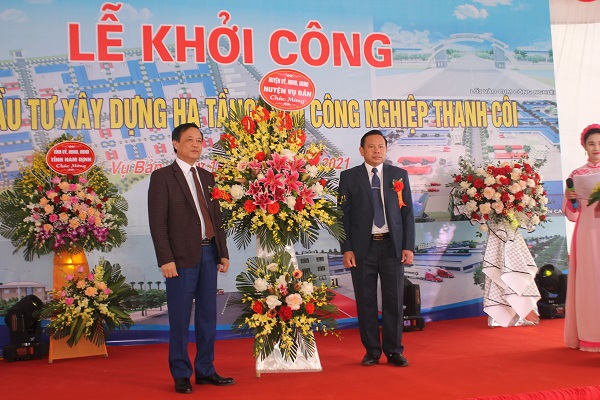Lãnh đạo huyện Vụ Bản (Nam Định) tặng hoa chúc mừng Lễ khởi công Dự án đầu tư xây dựng hạ tầng Cụm công nghiệp Thanh Côi.