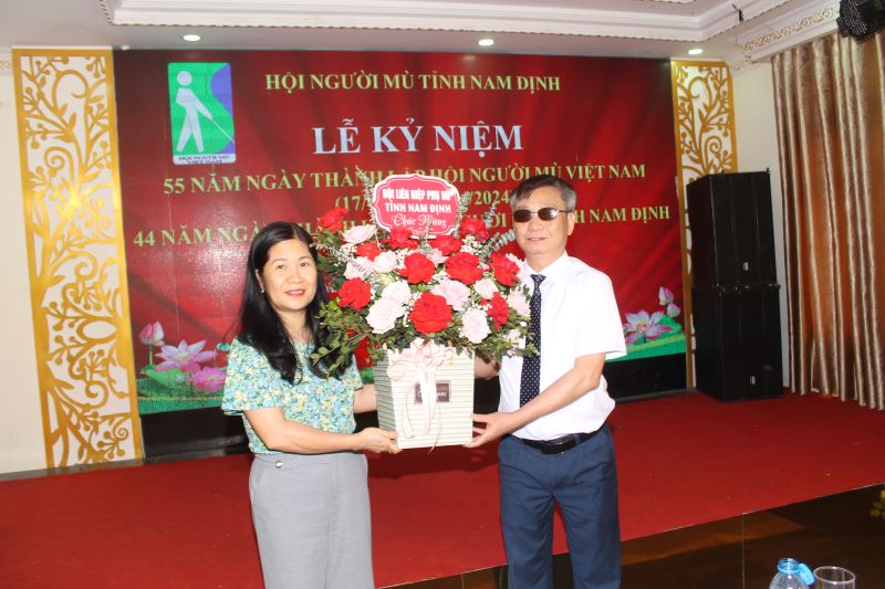 Đại diện Hội Liên hiệp phụ nữ tỉnh Nam Định tặng hoa chúc mừng Hội Người mù tỉnh Nam Định tại lễ kỷ niệm - Ảnh: Hồ Thanh