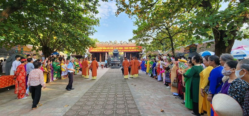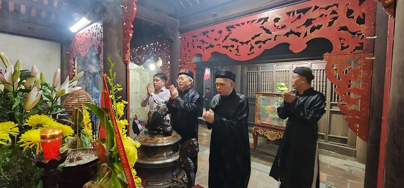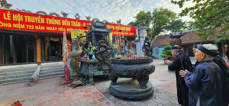 Cụ ông Trần Huy Chiến - Trưởng từ, BQL khu di tích đền Trần, cùng các cụ ông cao tuổi và quý đại biểu thập phương thắp hương tưởng niệm Đức Thánh Trần.