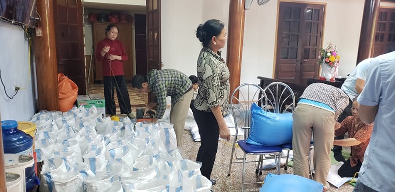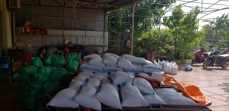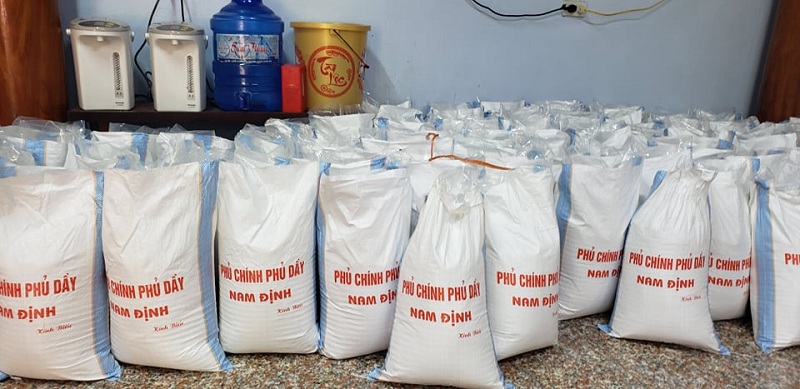 Cô Trần Kim Huệ cùng với nhiều người dân trong huyện Vụ Bản đóng gói cẩn thận những bao gạo trước khi mang ra tập kết trên xe tải.