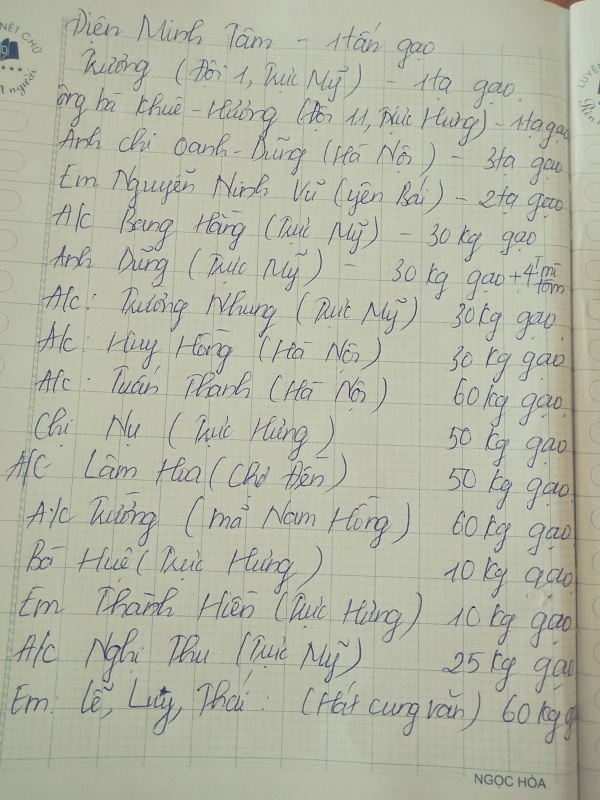 Chị Mai Thị Hải Yến - một người dân sinh sống trong thôn Nhật Tân đã vận động, quyên góp được 50kg gạo và 10 thùng mì tôm. Nhìn từng dòng chữ ngay ngắn chị ghi danh sách những hiện vật đã quyên góp được suốt mấy ngày qua đủ để thấy lòng cảm thông và sẻ chia của đồng bao ta đáng trân trọng biết bao.