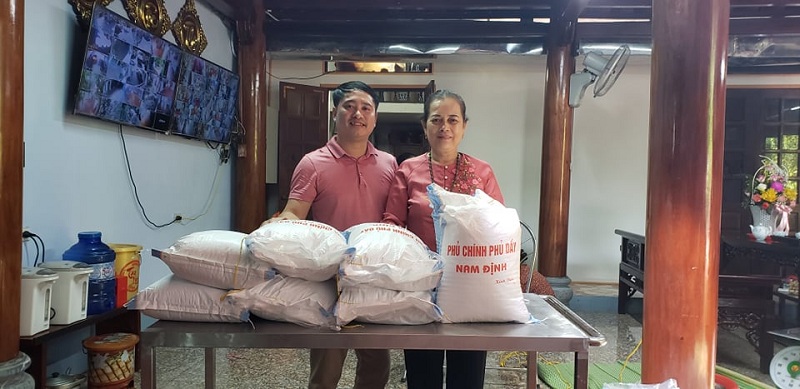 Cô Trần Kim Huệ - Thủ nhang Phủ Chính Tiên Hương phủ Dầy Nam Định trao 1 tấn gạo cho Nhà báo Phạm Tiến Thành - Đại diện Tạp chí Điện tử Hòa Nhập.
