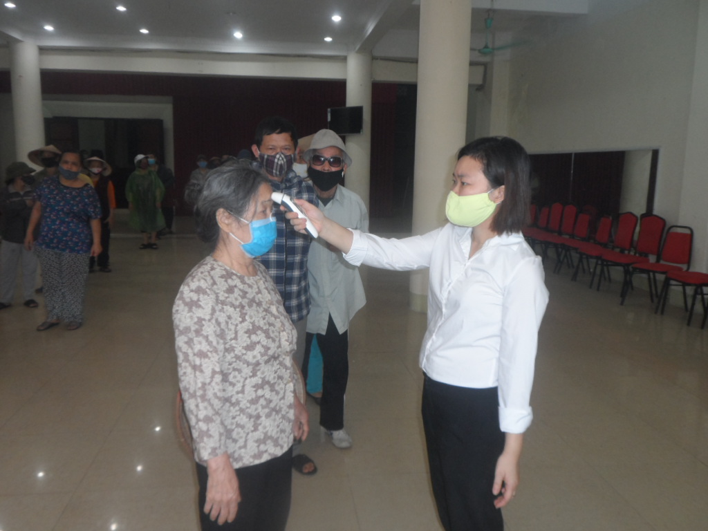 Đo thân nhiệt cho người nghèo trước khi vào vị trí nhận gạo.