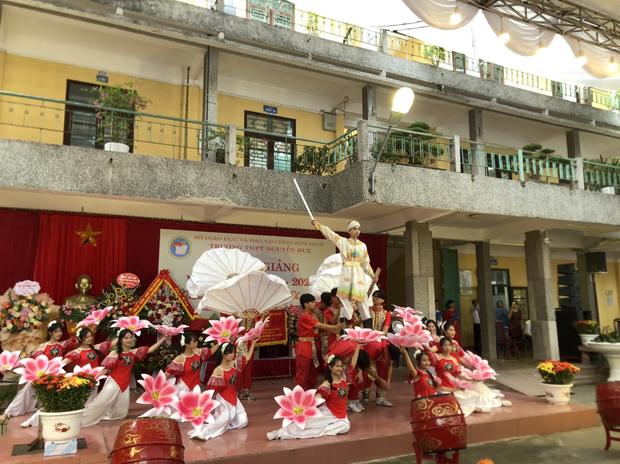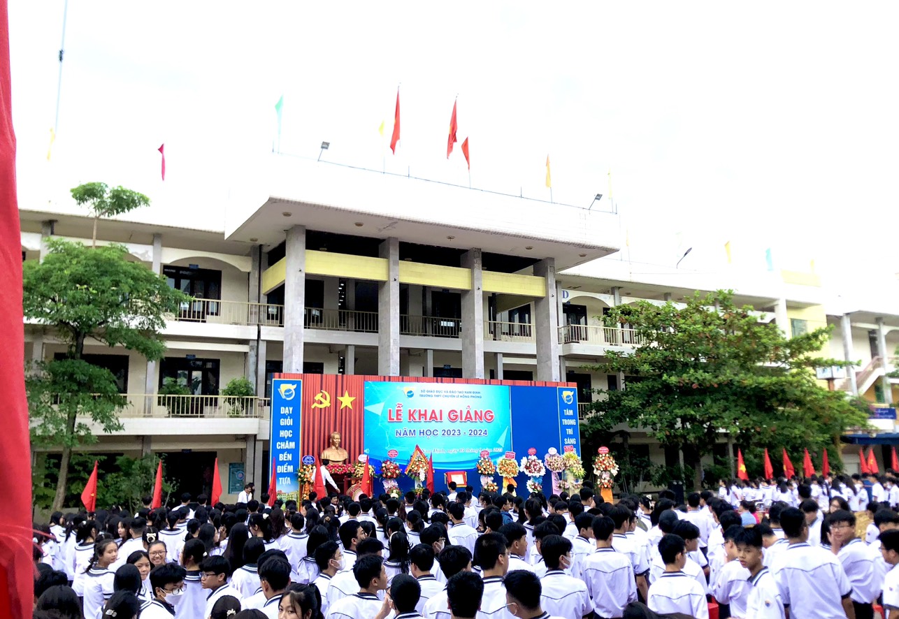 Sáng 5-9-2023, chúng tôi được tận mắt chứng kiến Lễ khai giảng năm học mới 2023-2024 tại Trường THPT Nguyễn Huệ, thành phố Nam Định, tỉnh Nam Định. Đây là mái trường được thành lập từ năm 1976, đã trải qua gần nửa thế kỷ xây dựng và phát triển. Nhiều năm học nhà trường đã được đón nhận danh hiệu “Tập thể Lao động xuất sắc”, nhiều giáo viên được nhận Bằng khen của Bộ trưởng Bộ GD&ĐT, Bằng khen của Chủ tịch UBND tỉnh Nam Định. Cô giáo Nguyễn Thị Thu Thủy, Hiệu trưởng nhà trường cho biết: Năm học 2022-2023, nhà trường có 24 lớp học với 1.017 học sinh, 60 cán bộ, giáo viên, nhân viên; 100% học sinh xếp loại hạnh kiểm tốt và khá; 99,51% học sinh xếp loại học lực giỏi và khá, không có học sinh yếu. Điểm trung bình kỳ thi tốt nghiệp năm học 2022-2023 của nhà trường xếp 6 toàn tỉnh Nam Định; thi học sinh giỏi các môn văn hóa cấp tỉnh đạt 28 giải (gồm 2 giải Nhất, 6 giải Nhì, 9 giải Ba, 11 giải Khuyến khích). Nhiều cán bộ quản lý, giáo viên của nhà trường đã được Bộ trưởng Bộ GD&ĐT, Chủ tịch UBND tỉnh Nam Định tặng Bằng khen, Giám đốc Sở GD&ĐT tỉnh Nam Định tặng giấy khen. Trường THPT Nguyễn Huệ được Chủ tịch UBND tỉnh Nam Định trao tặng Cờ “Đơn vị dẫn đầu phong trào thi đua”. Năm học mới 2023-2024 Trường THPT Nguyễn Huệ có 1.114 học sinh, trong đó có 407 học sinh lớp 10. Khát vọng phát triển của nhà trường là tiếp tục đoàn kết, sáng tạo, triển khai thực hiện tốt Chương trình giáo dục phổ thông 2018 đối với lớp 10, lớp 11, thực hiện Chương trình GDPT 2006 đối với lớp 12, hoàn thành xuất sắc chương trình nhiệm vụ năm học; tiếp tục khẳng định vị thế, thương hiệu, tô thắm thêm truyền thống vẻ vang của nhà trường.