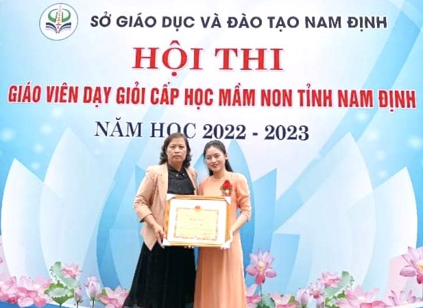 Cô giáo Phạm Thị Thu, Trường Mầm non thị trấn Xuân Trường (người đứng bên phải) tham dự “Hội thi giáo viên dạy giỏi cấp học mầm non” đoạt giải Nhất tỉnh Nam Định- Ảnh do cơ sở cung cấp.