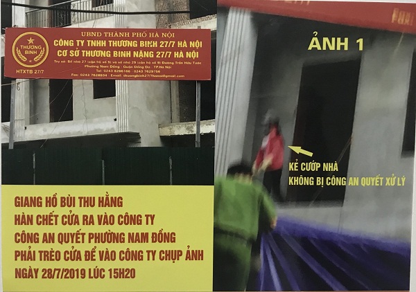 Theo đơn thư, ngày 13/8/2019, những cá nhân thuộc giới xã hội đen đã tấn công, cướp nhà, phá huỷ cơ sở sản xuất, kinh doanh của các bác thương binh thuộc Công ty Thương binh 27/7. Những cá nhân này đã hàn cổng ra vào của Công ty, phá hàng rào tôn, phá khóa vào nhà công ty. Họ đã cướp đi rất nhiều tài sản, máy móc, bàn ghế, nguyên liệu sắt thép, tôn, cửa sắt trị giá hàng chục triệu đồng. Họ xông vào cướp nhà của Công ty, phá huỷ và cướp đi biển hiệu cùng 2 cột sắt của Công ty có trị giá gần 20 triệu đồng trước sự chứng kiến của một số cán bộ công an. Công an Sơn (SĐT: 0904400012) đã lập biên bản. Trước hành vi đó, Công ty Thương binh 27/7 đã đến Công an phường Nam Đồng trình báo. 19 giờ cùng ngày Công an phường đã cùng cán bộ Thảo, Hùng, thương binh xuống cơ sở sản xuất, kinh doanh của thương binh Công ty 27/7 không vào được vì đã bị những cá nhân thuộc giới xã hội đen phá khóa cổng, hàn chết cửa Cổng không vào được phải đi đường hàng rào mà nhóm đối tượng kia đã phá để vào công ty. Công an đã chụp lại toàn bộ cảnh tượng mà nhóm đối tượng này phá huỷ cơ sở sản xuất, kinh doanh của Công ty Thương binh 27/7.