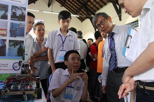 | Trần Phan Thanh Hải đang giới thiệu về đề tài Robot hỗ trợ đa ngành nghề dành cho người bị bại liệt |