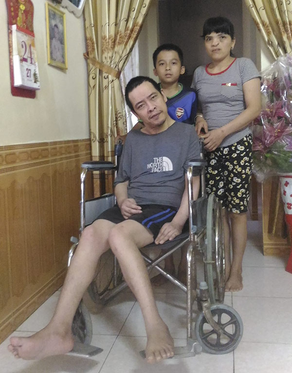 Chồng chị Yến là anh Ngô Xuân Bình, 41 tuổi, quê ở xóm 2, xã Hưng Chính (thành phố Vinh, Nghệ An). Anh là con đầu trong gia đình có 5 anh em. Bị di chứng chất độc da cam từ người cha nên Bình lúc mới sinh ra thân hình cũng không lành lặn. Trong gia đình anh, một người em trai cũng bị di chứng chất độc da cam hiện bị câm điếc, tâm thần khiến cuộc sống của gia đình càng thêm chật vật. Do bị bệnh nặng hơn nên anh Bình không làm được việc gì kể cả vệ sinh cá nhân. Hai chân bị liệt nên việc di chuyển của anh cũng rất khó khăn.
