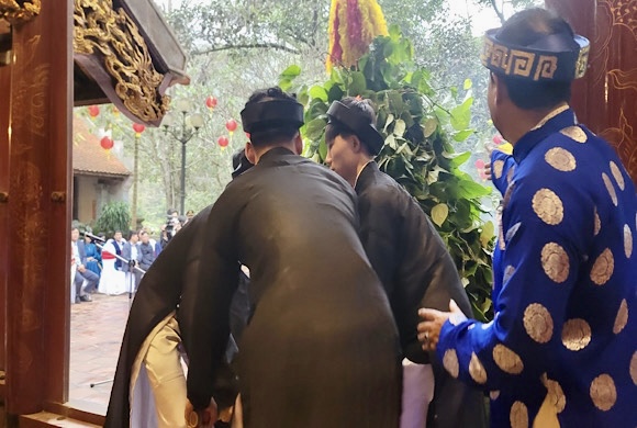 Dân làng cúng tiến vật phẩm lên Đức Thánh Gióng