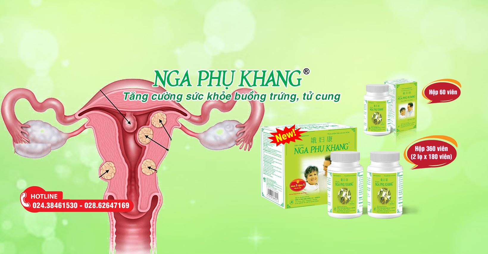 NGA PHỤ KHANG - Hỗ trợ giảm sự tiến triển của u nang buồng trứng, u xơ tử cung, u vú, u xơ tiền liệt tuyến lành tính Đối tượng sử dụng: Phụ nữ bị u nang buồng trứng, u xơ tử cung, nam giới bị u phì đại tiền liệt tuyến lành tính. Thành phần: Cao trinh nữ hoàng cung (0,312g), cao hoàng kỳ (0,085g), cao hoàng cầm (0,072g), khương hoàng (0,031g). Công dụng: Hỗ trợ giảm sự tiến triển của u nang buồng trứng, u xơ tử cung, u vú, u xơ tiền liệt tuyến lành tính. Cách dùng: - Liều hỗ trợ duy trì: Ngày uống 3 lần, mỗi lần 2 viên, nên uống trước bữa ăn 30 phút. - Liều hỗ trợ tăng cường: Ngày uống 3 lần, mỗi lần 3 viên, nên uống trước bữa ăn 30 phút. Nên sử dụng liên tục từ 2 - 3 tháng để cho kết quả tốt nhất.