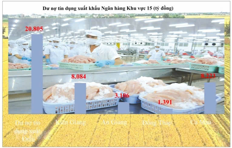 Số liệu thống kê từ Ngân hàng Nhà nước chi nhánh khu vực 15 cho thấy, đến cuối tháng 4/2025, dư nợ tín dụng XK đạt 20.804 tỷ đồng, chiếm 4,5% tổng dư nợ tín dụng khu vực 15. Trong đó: 4 tỉnh có dư nợ tín dụng XK lần lượt là Kiên Giang (8.084 tỷ đồng); An Giang (3.106 tỷ đồng), Đồng Tháp (1.391 tỷ đồng) và Cà Mau (8.223 tỷ đồng).