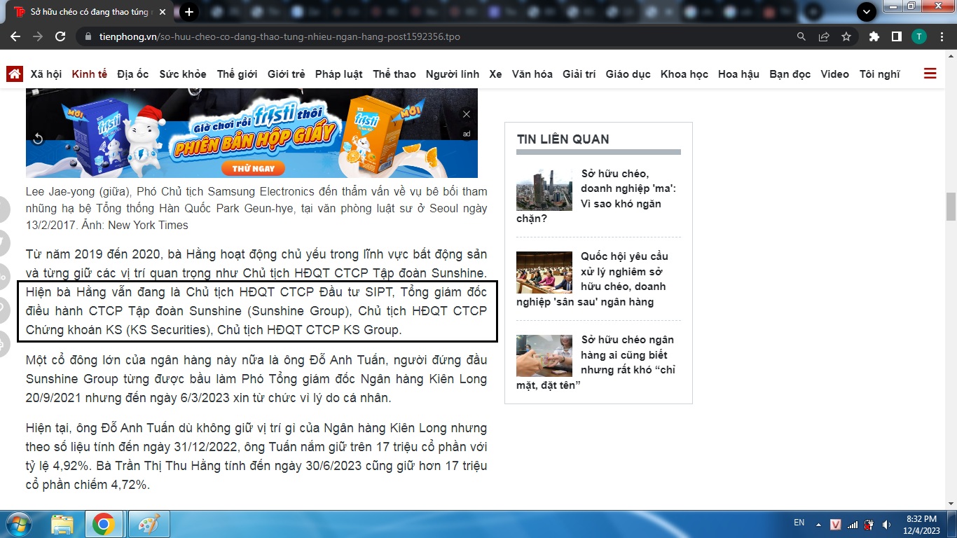Ảnh chụp màn hình đường link https://tienphong.vn/so-huu-cheo-co-dang-thao-tung-nhieu-ngan-hang-post1592356.tpo bài viết Sở hữu chéo có đang thao túng nhiều ngân hàng? trên Báo Tiền Phong ngày 4/12/2023