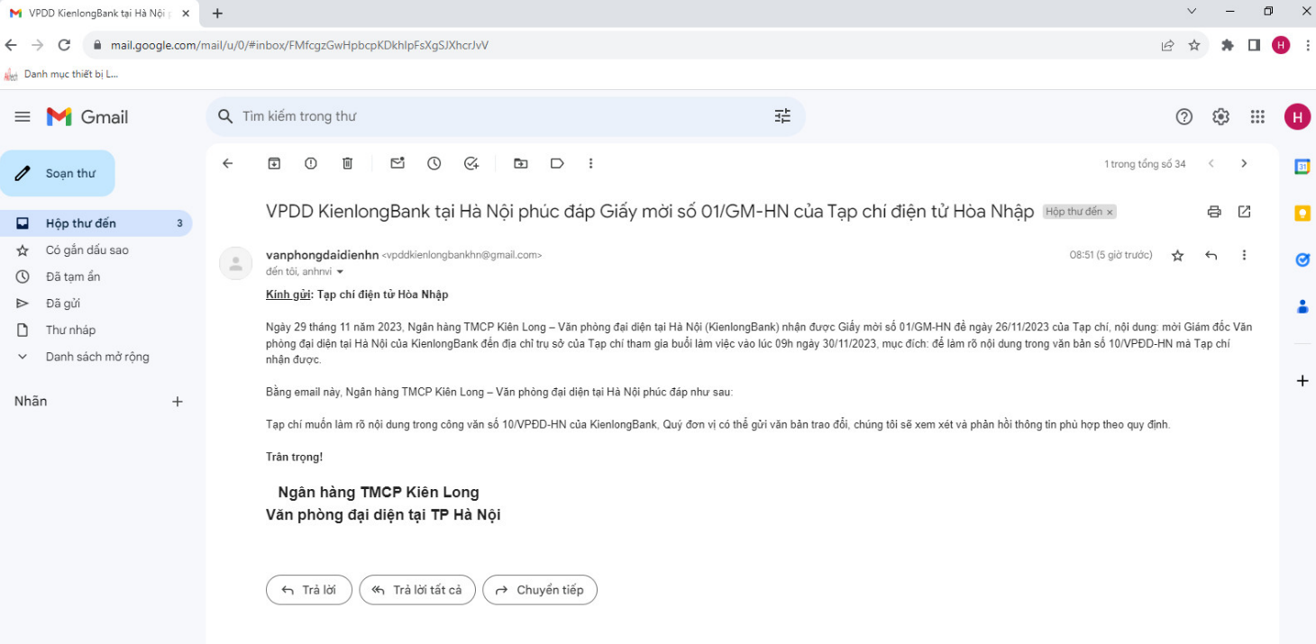 Để đảm bảo thông tin đầy đủ, khách quan, ngày 26/11/2023, Tạp chí đã gửi giấy mời Giám đốc Văn phòng đại diện tại Hà Nội Ngân hàng Kiên Long tới tòa soạn vào ngày 30/11/2023 để trao đổi thông tin liên quan đến công văn số 10/VPDDHN. Tuy nhiên, ngày 30/11/2023 Văn phòng Hà Nội Ngân hàng Kiên Long gửi email với nội dung.