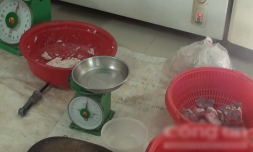Cứ 1 kg thịt nạc thối và 0,5 kg mỡ, chủ cơ sở đem trộn với 1,5 muỗng chất Borax rồi xay nhuyễn đưa vào khuôn đúc thành các cây chả lụa.