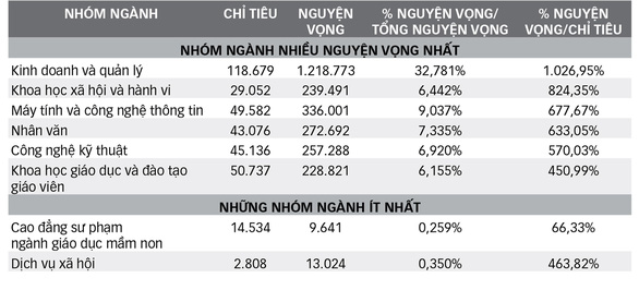 Theo đó, dẫn đầu là nhóm Kinh doanh và quản lý, với 1.218.773 nguyện vọng, trong khi chỉ tiêu chỉ có 118.679.