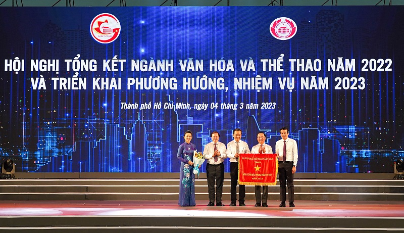 Thứ trưởng Tạ Quang Đông tặng cờ thi đua cho ban lãnh đạo Sở Văn hóa và Thể thao TP Hồ Chí Minh.