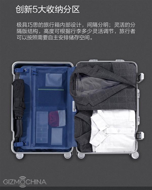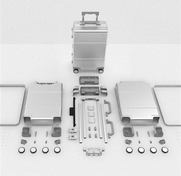 Chiếc va li có kích thước 550x375x215 mm, dung tích 31 lít. Toàn bộ chiếc vali làm từ hợp kim nhôm-magiê (vốn vẫn được sử dụng trong công nghiệp hàng không chế tạo máy bay) có độ bền cao nhưng rất nhẹ - chỉ 4,4 kg. Tay kéo mở rộng điều chỉnh được 4 độ cao để bạn thuận tiện cầm hoặc kéo mà không bị mỏi. Được biết Xiaomi đã mời một số nhà thiết kế nổi tiếng người Đức (giấu tên) tham gia vào dự án này.