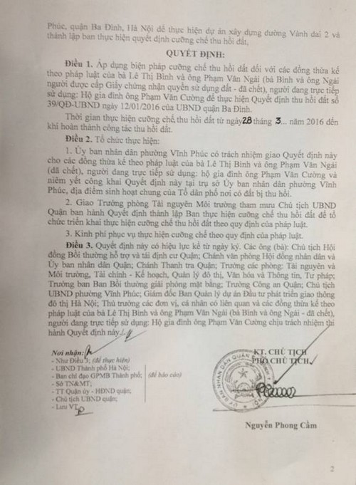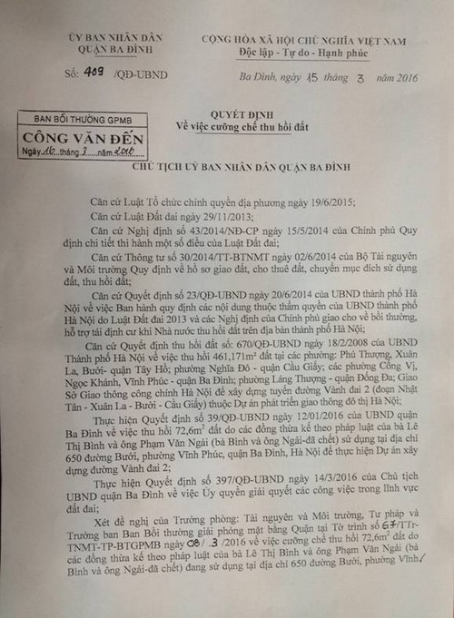 Ngày 15/3/2016, UBND quận Ba Đình ban hành Quyết định số 409/QĐ-UBND cưỡng chế thu hồi 72,6m2 đất do các đồng thừa kế theo pháp luật của bà Lê Thị Bình và ông Phạm Văn Ngải (bà Bình và ông Ngải – đã chết) đang sử dụng tại địa chỉ 650 đường Bưởi, phường Vĩnh Phúc để thực hiện dự án xây dựng đường Vành đai 2. Theo đó, quận Ba Đình sẽ áp dụng biện pháp cưỡng chế thu hồi diện tích đất này đối với người đang trực tiếp sử dụng là hộ gia đình ông Phạm Văn Cường, thời gian thực hiện cưỡng chế, thu hồi đất từ ngày 28/3/2016 đến khi hoàn thành công tác thu hồi đất. Phương án đền bù, bồi thường, hỗ trợ GPMB đối với hộ ông Phạm Văn Cường là 3,450 tỷ đồng, đồng thời, quận cũng bố trí 01 căn hộ tái định cư tại dự án Thành phố Giao lưu (quận Bắc Từ Liêm) có diện tích 74,68m2 cho hộ gia đình ông Cường nếu có nhu cầu mua.