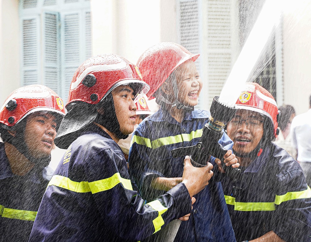 Cái đập tay hạnh phúc cùng các chiến sĩ của Trung Quân sau khi diễn tập công tác chữa cháy.