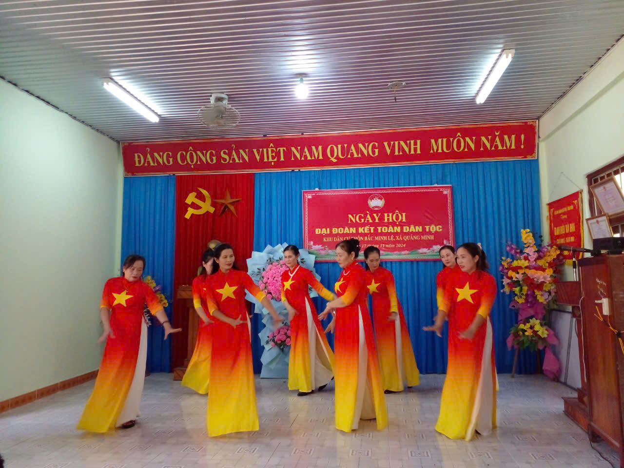 Ngày hội đại đoàn kết của khu dân cư thôn Bắc Minh Lệ, xã Quảng Minh diễn ra sôi nổi với nhiều tiết mục văn nghệ đa dạng phong phú, đặc sắc với những bài hát vui tươi ca ngợi Đảng, Bác Hồ, quê hương đất nước, sự đoàn kết của Mặt trận tổ quốc Việt Nam do chính những người dân trong khu dân cư tự dàn dựng tập luyện và biểu diễn.