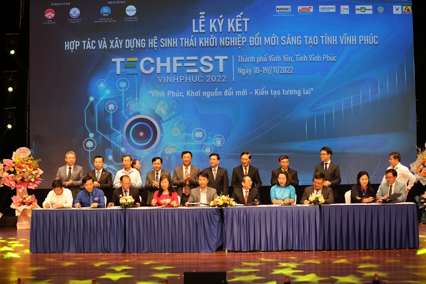 Tại lễ khai mạc, các vị lãnh đạo, đại biểu đã ký kết hợp tác và xây dựng hệ sinh thái khởi nghiệp đổi mới sáng tạo tỉnh Vĩnh Phúc - Techfest VinhPhuc 2022.