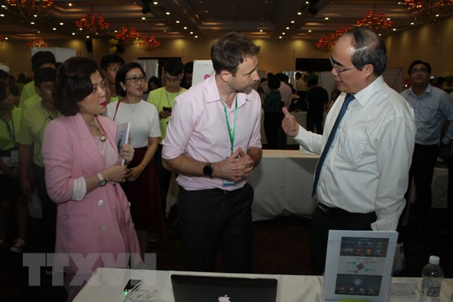 | Bí thư Thành ủy Thành phố Hồ Chí Minh Nguyễn Thiện Nhân trao đổi với đại diện Dự án khởi nghiệp EcoWorth-Tech. (Ảnh: Tiến Lực/TTXVN) |