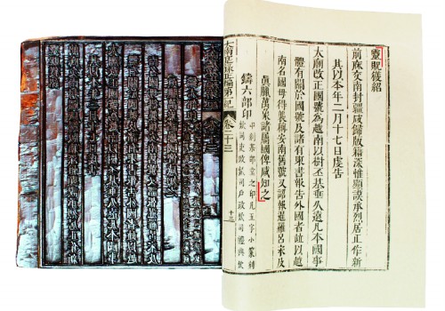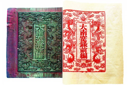 | Mộc bản và bản dập bìa sách “Đại Nam thực lục tiền biên”. |