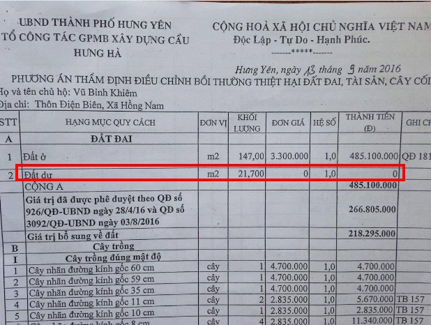 Trong tất cả phương án đền bù của những hộ bị thu hồi, đất dư đều được tính bằng 0 đồng