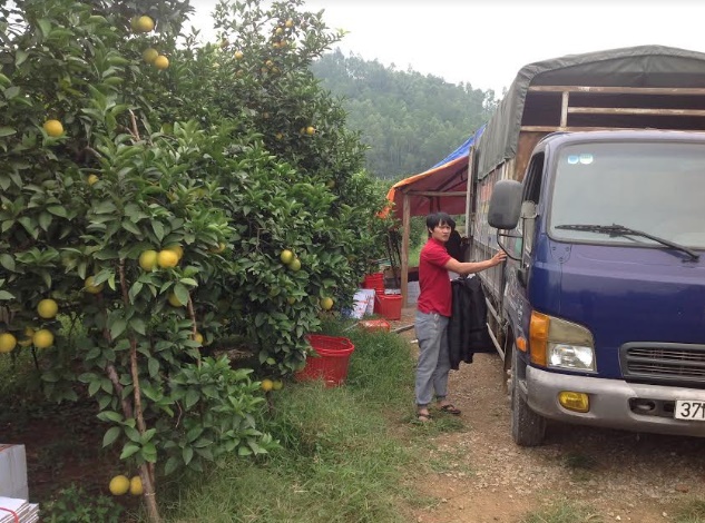 Để đưa ra giá bán 75.000đồng/kg, chủ trang trại cam Thiên Sơn không bán cam tại nơi thu hoạch mà chở về TP Vinh “phân phối” cho các đại lý.