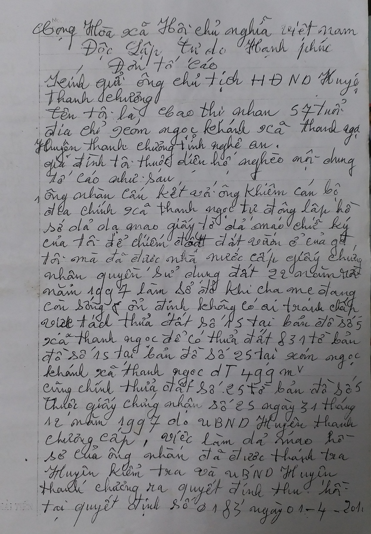 Khoảng tháng 6 năm 2015, bà Cao Thị Nhan (57 tuổi, trú tại xóm Ngọc Khánh, xã Thanh Ngọc) có đơn gửi Chủ tịch UBND huyện Thanh Chương, Nội dung đơn phản ánh: Năm 2008, thực hiện chủ trương đo đạc, cấp đổi giấy chứng nhận quyền sử dụng đất, tại sao trong hồ sơ cấp đổi giấy chứng nhận quyền sử dụng đất của bà lại có chữ ký giả mạo?
