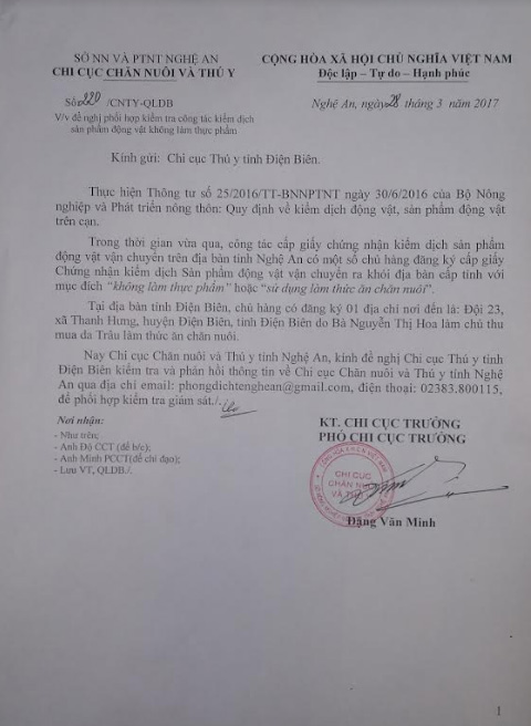 Thay vì giải quyết, Chi cục Chăn nuôi – Thú y tỉnh Nghệ An lại làm văn bản hỏi Chi cục Chăn nuôi - Thú y tỉnh Điện Biên về địa chỉ tiêu thụ sản phẩm