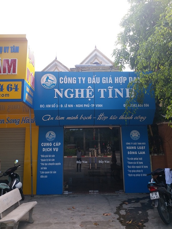 | Văn phòng giao dịch của Công ty Đấu giá Hợp danh Nghệ Tĩnh và Công ty TNHH MTV Hàng Luật Sông Lam (tại km số 3 đại lộ Lê Nin, TP Vinh) |