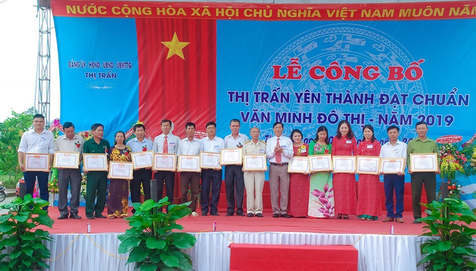 Tại lễ công bố, đồng chí Phan Văn Tuyên - Chủ tịch UBND huyện Yên Thành đã trao bằng công nhận “Thị trấn Yên Thành đạt chuẩn văn minh đô thị giai đoạn 2018-2919”. 15 tập thể và cá nhân được Chủ tịch UBND tỉnh Nghệ An, chủ tịch UBND huyện Yên Thành tặng bằng khen, giấy khen. 17 tập thể và cá nhân được Chủ tịch UBND Thị trấn tặng giấy khen.