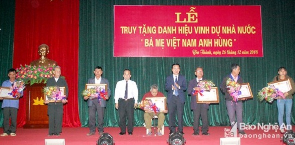 Theo đó, ngày 26/12, huyện Yên Thành đã long trọng tổ chức Lễ truy tặng Danh hiệu vinh dự Nhà nước cho 7 Mẹ Việt Nam anh hùng gồm: Mẹ Nguyễn Thị Tiu, trú ở xã Sơn Thành; Mẹ Hà Thị Hai, trú ở xã Mã Thành; Mẹ Lê Thị Tiệu, trú ở xã Đô Thành; Mẹ Bùi Thị Kiệm, trú ở xã Hùng Thành; Mẹ Nguyễn Thị Bòi, trú ở xã Phúc Thành; Mẹ Hà Thị Lòn và Mẹ Trần Thị Duệ, trú ở xã Tiến Thành.