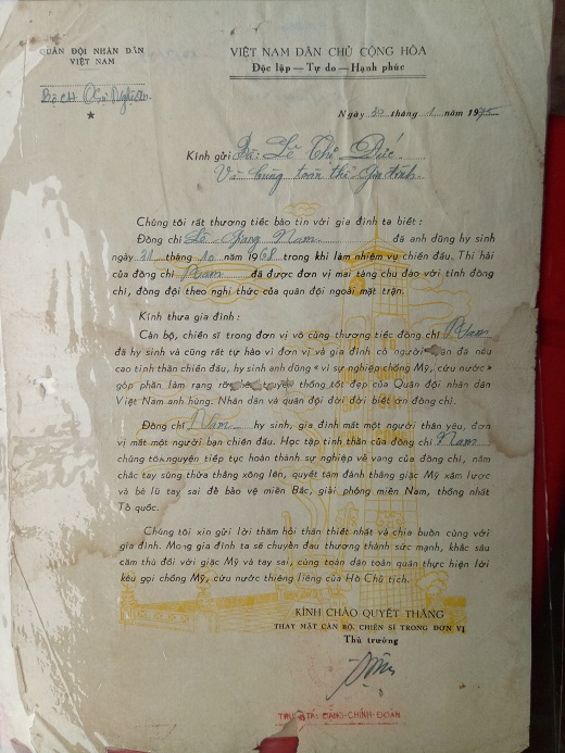 | Giấy báo tử của ông Lê Giang Nam |