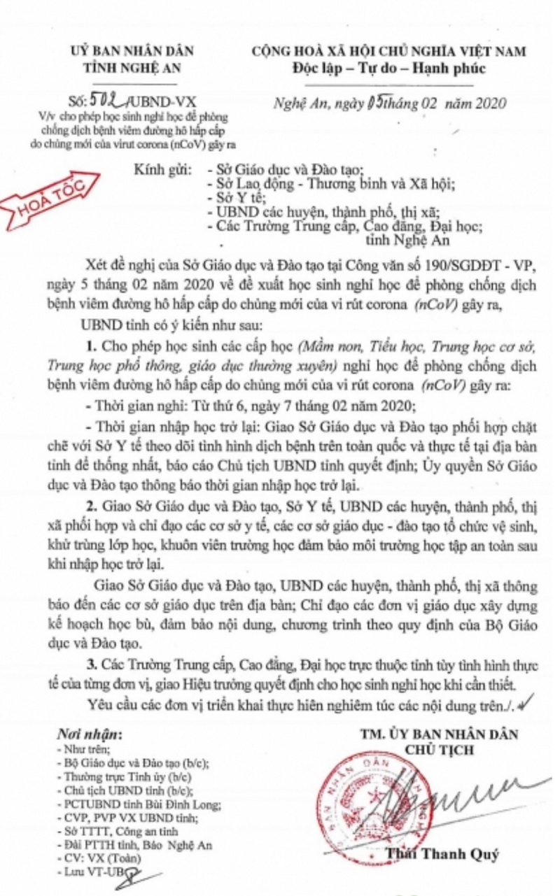 Theo đó, tại công văn “hỏa tốc” số 502/UBND-VX của UBND tỉnh Nghệ An đã cho phép học sinh các cấp học: Mầm non, Tiểu học, Trung học cơ sở, Trung học phổ thông, Giáo dục thường xuyên nghỉ học từ thứ 6, ngày 7 tháng 2 năm 2020. Để đảm bảo phòng chống dịch bệnh viêm đường hô hấp cấp do chủng mới của virus corona (nCoV) gây ra đối với các em học sinh.
